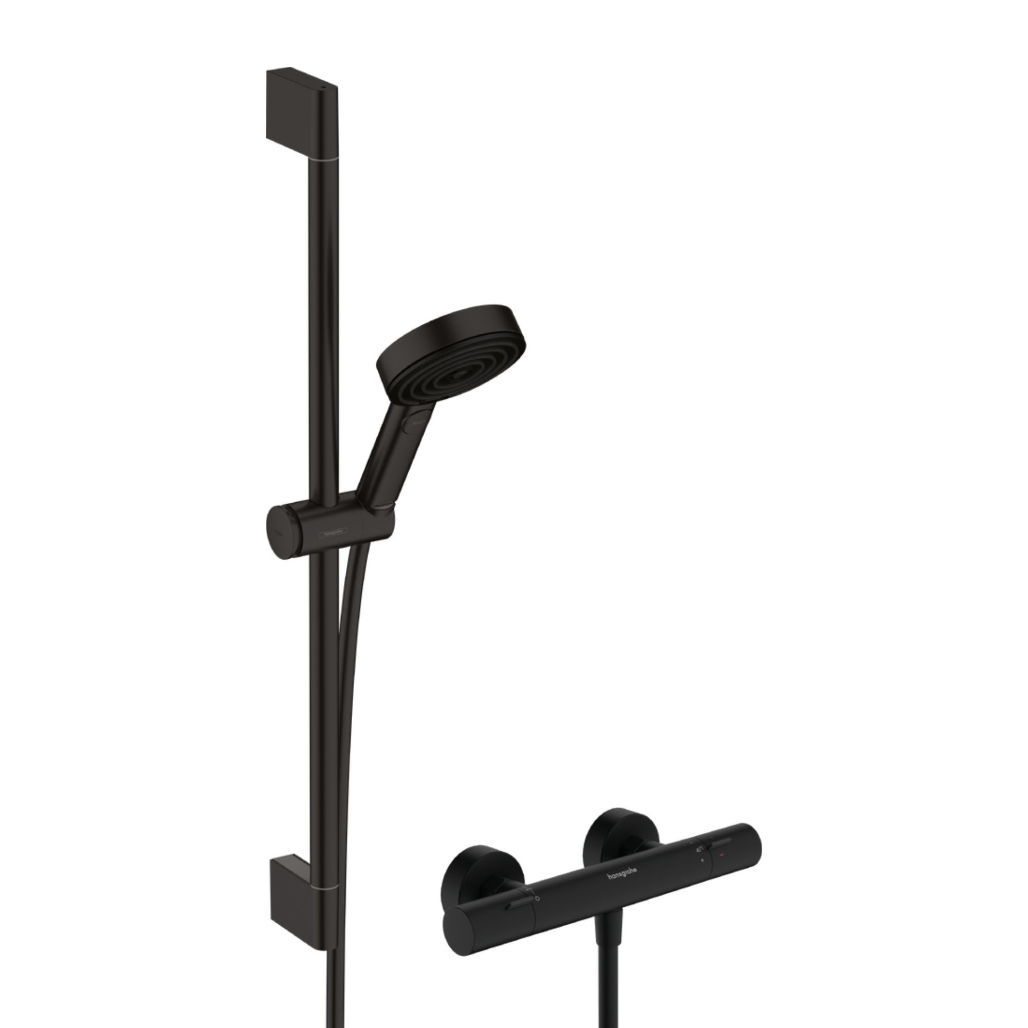 Granlusso Portofino 2 Outlet Thermostatic Shower Valve With Pencil Handset and Fixed Overhead - Black MattPortofino Matt Black shower set with shower head, control handle, and handheld shower on a white background Deluxe Bathrooms