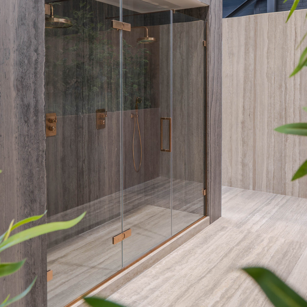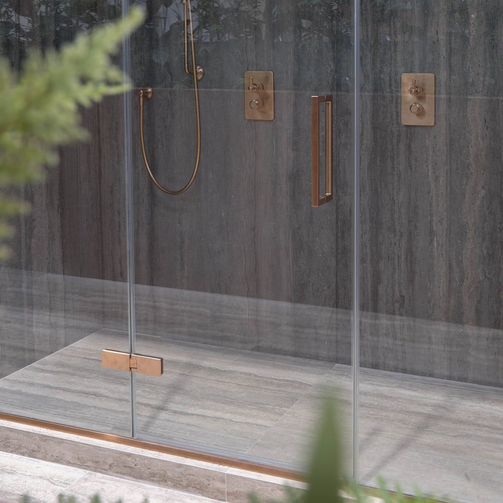 Aureo Ten Hinge Shower Door with 2 Inline Panels In Recess - Brushed Bronze