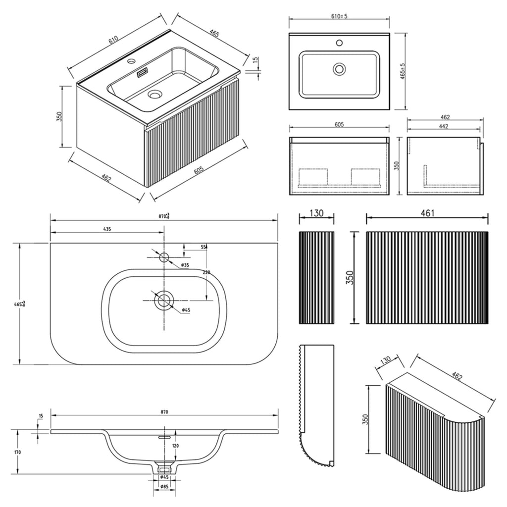 Florence Fluted 870 Curved Wall Mounted Vanity Unit With Matt Stone Basin - Smoked Sage