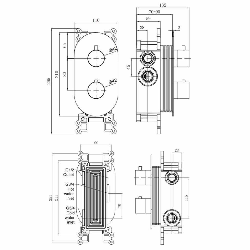 Granlusso Portofino 2 Outlet Thermostatic Shower Valve With Pencil Handset and Fixed Overhead - Brushed Bronze