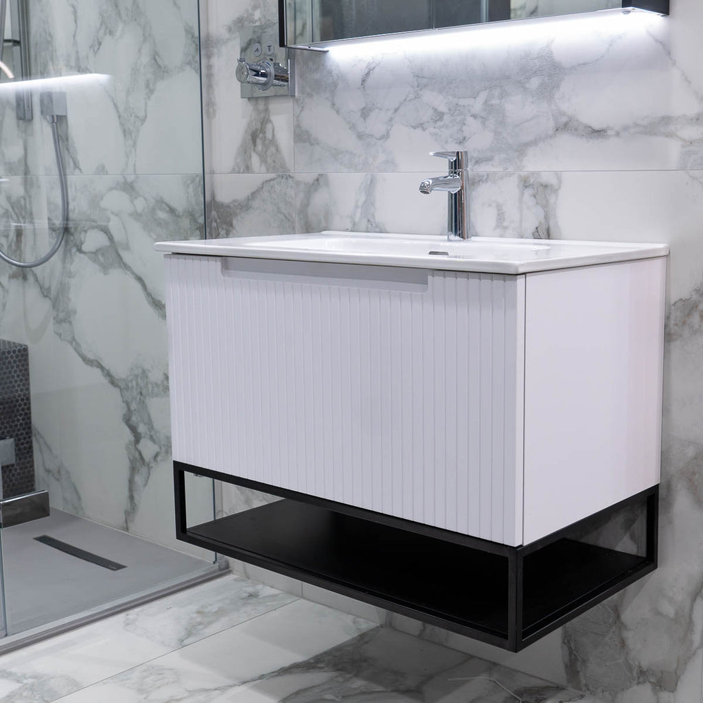 Harmony 800 Wall Mounted Vanity Unit With Ceramic Basin and Open Bottom Shelf - White